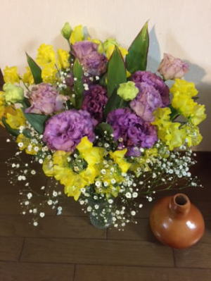 5周年のお祝いに綺麗な花束を届けてくれました。うす紫色と黄色の組み合わせがとても癒される感じで毎年の心遣いに感謝です。